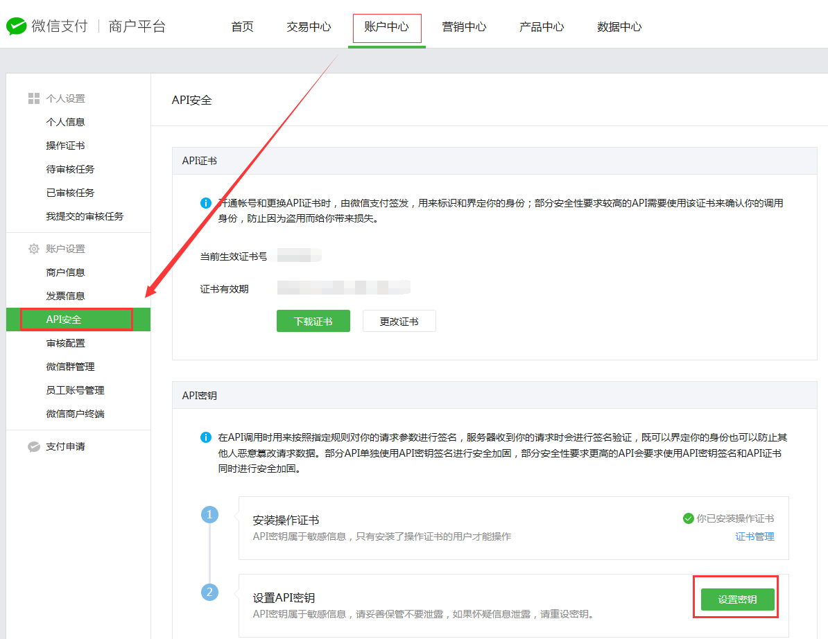 “账户中心”——“API安全”设置32位数密钥,设置好后,填写第一步到拓维物业后台的位置