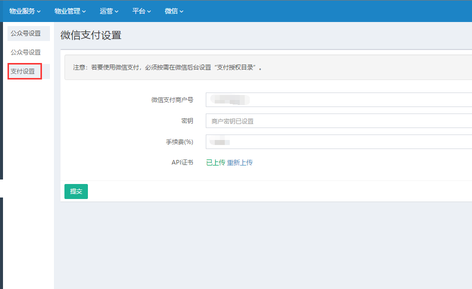 登录公众号——“微信支付”这里的商户号,填写第一步到拓维物业后台的位置