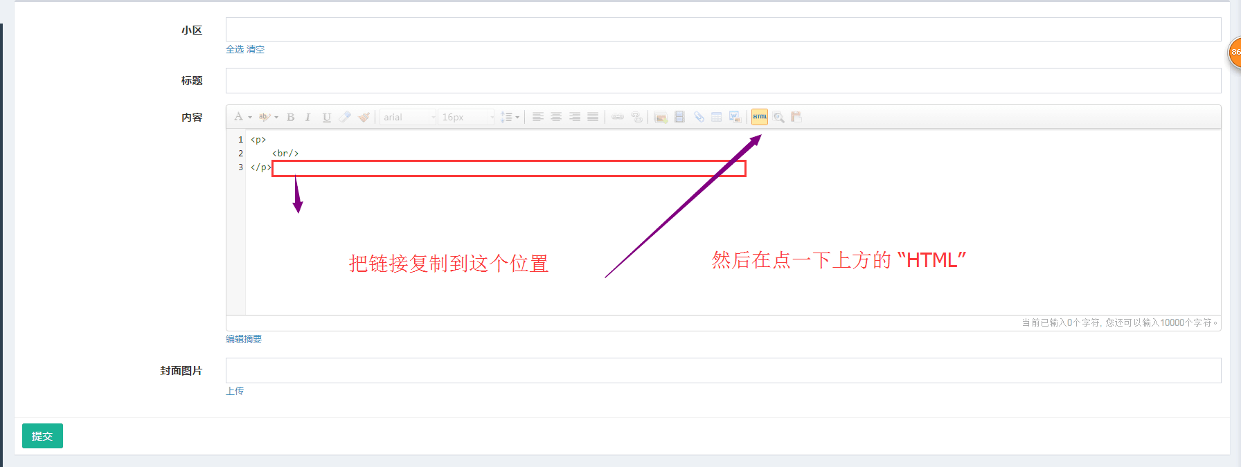 3、在拓维物业编辑栏点开HTML把链接更改后复制到图上框出的位置